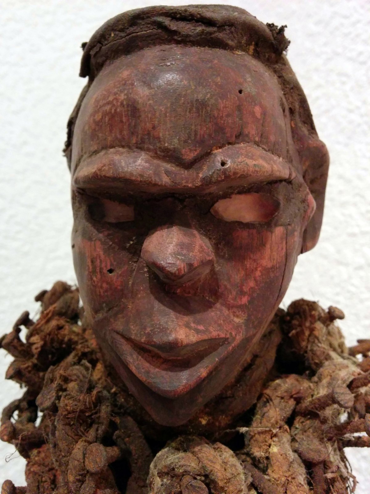 Unter anderem neu in meiner Sammlung befindet sich diese grimmig aussehende nkisi nkondi. Mit 30 cm ist diese nkondi verhältnismäßig klein. Der Körper ist aus einem Stück Holz geschnitzt, Haare und Zopf aus Textil geformt, in die pupillenlosen Augen ist ganz traditionell Glas eingelassen, der Körper ist eher unsymmetrisch mit Nägeln bestückt, während das Seil den Körper in sorgfältig gelegten Schleifen umwickelt. Unter dem Seil befindet sich – möglicherweise als Behältnis ausgeformtes – Textil.