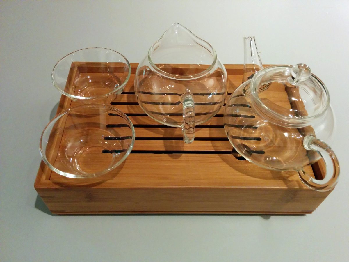 Niedliches Teeset, das mir viel mehr Freude bereitet, als ich je für möglich gehalten hätte. Seit ich es habe, kommt es fast täglich zum Einsatz. Das Set besteht aus einem schön gearbeiteten Teetisch aus Bambus, einer Teekanne und einer Servierkanne (je 200 ml) und zwei Teeschalen (50 ml). Die Teekanne besitzt einen dieser simplen, aber unglaublich praktischen Edelstahlfilter, die direkt in der Tülle sitzen. Geeignet quasi für alle Blatttees.