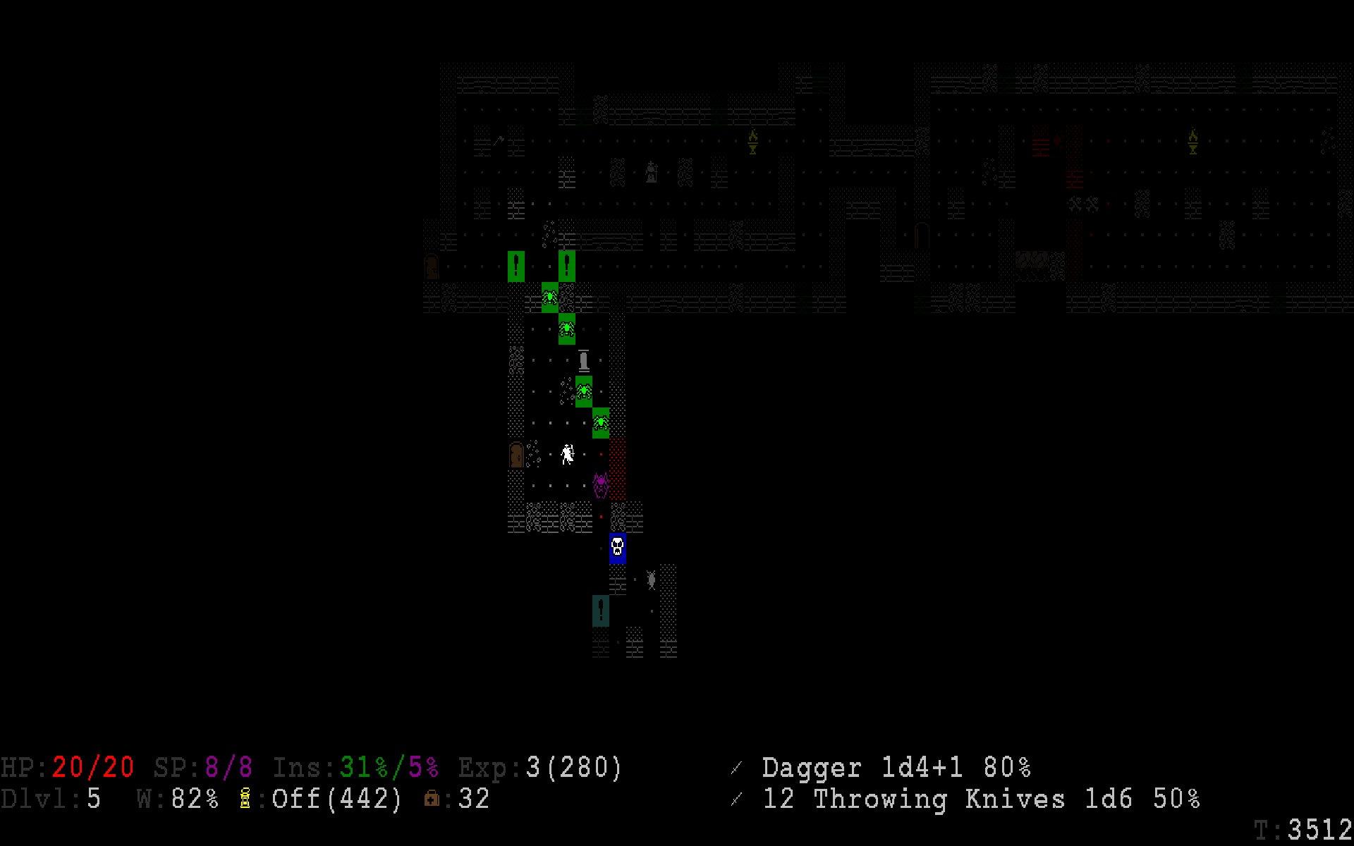 Grafisch überzeugt das Spiel mit einem einfachen und übersichtlichen Tile-Set. Der folgende Screenshot zeigt ungefähr in der Mitte, lilafarben, die Leng-Spinne, die der Lovecraft-Leser aus The Dream-Quest of Unknown Kadath kennt (dt.: Die Traumsuche nach dem unbekannten Kadath). Kurz zuvor habe ich hier eine Scroll of summon Creature benutzt, die mir die kleinen grünen Spinnen als Helfer beschert hat. Diese greifen autonom alle Feinde in Reichweite an. Wie hier zu erkennen, ist immer nur der Teil der Katakomben sichtbar, der sich in Sichtweite befindet. Karten gibt es in Infra Arcana nicht. Die sind allerdings auch nicht nötig, da der Algorithmus das Level-Layout nicht allzu komplex generiert.