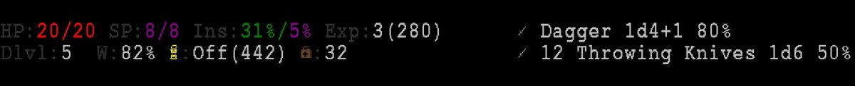 Für welchen Charakter man sich auch entscheidet, nach dem Spielstart erlebt der Anfänger beim Blick ins Inventar eine positive Überraschung. Im Gegensatz zu vielen anderen Roguelikes, startet man in Infra Arcana mit einer soliden Ausrüstung. Im Falle des Rogue sind das: ein Dolch, ein M1911 Colt mit 14 Patronen, 12 Wurfmesser, 8 Eisenspikes zum Werfen und Türenblockieren, 2 Dynamitstangen, 2 Molotovcocktails, Lederjacke, elektrische Laterne und eine Medizintasche um Wunden und Infektionen zu behandeln.