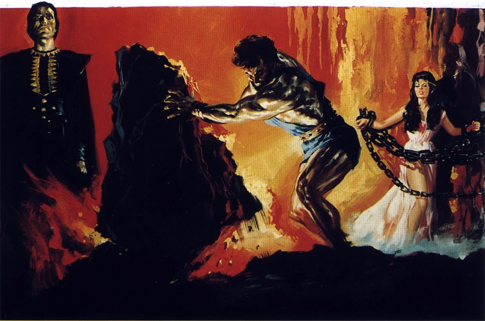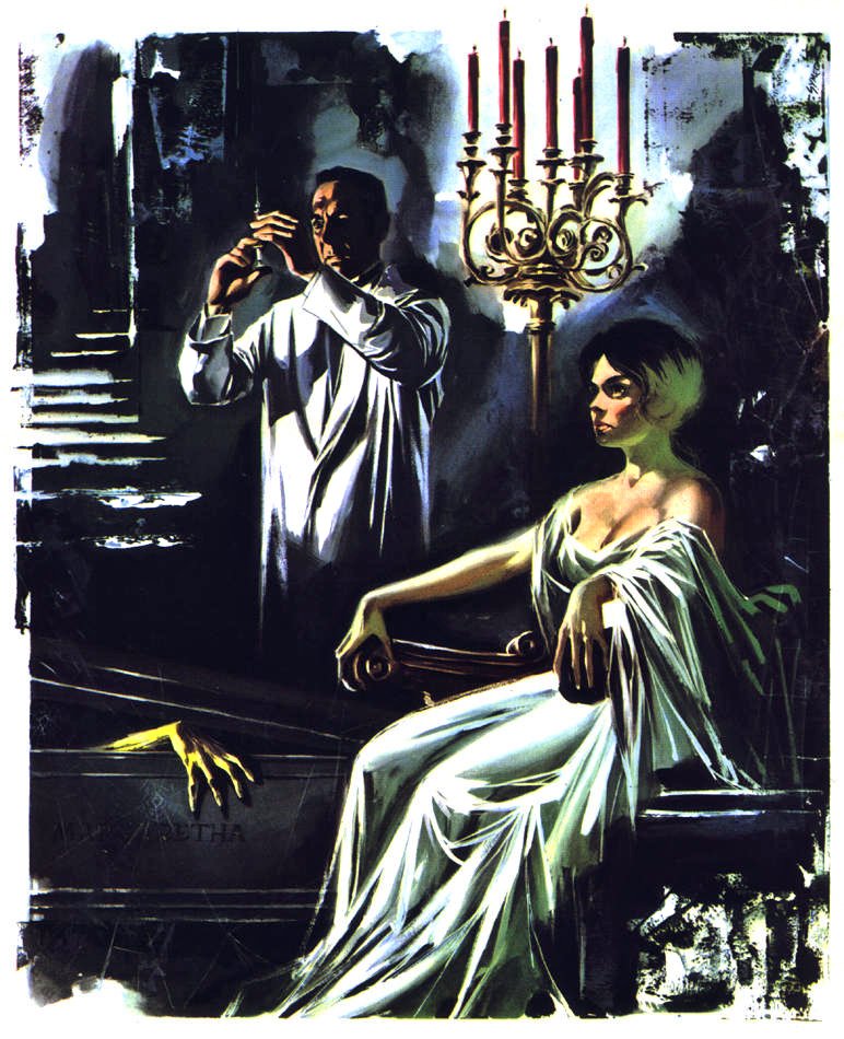 Links: Plakatmotiv von Sandro Simeoni für Das schreckliche Geheimnis des Dr. Hichcock (1962). Rechts oben: unverwendetes Motiv für Vampire gegen Herakles (1961), Künstler unbekannt. Rechts unten: unverwendetes Motiv von Mort Künstler für Der Pate (1974).