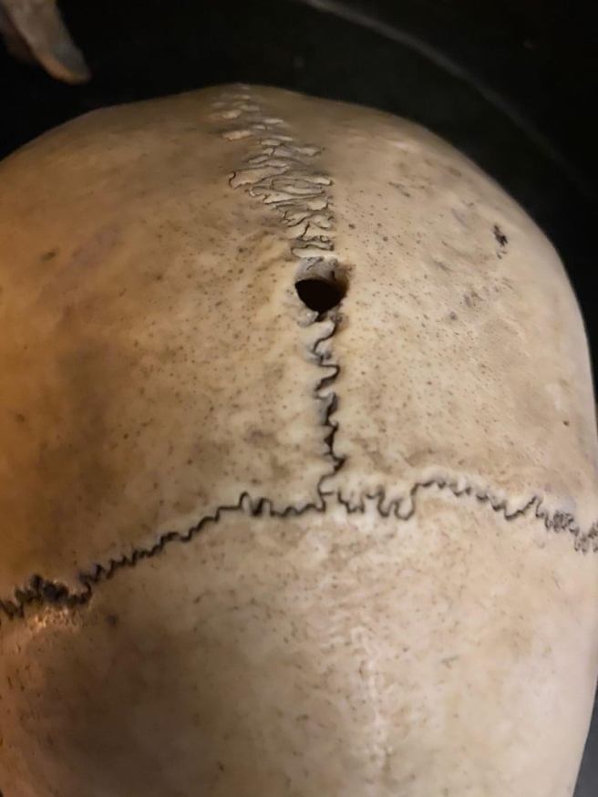Ich habe hier einen Schädel, der offenbar von einem artikulierten Skelett stammt, da er oben das charakteristische Loch hat, wo das Skelett normalerweise aufgehängt ist. Wenn man sich erkundigt, wie man solche Löcher am besten verschließt, wird Epoxidharz, Holzleim oder Sekundenkleber mit Knochenmehl empfohlen.