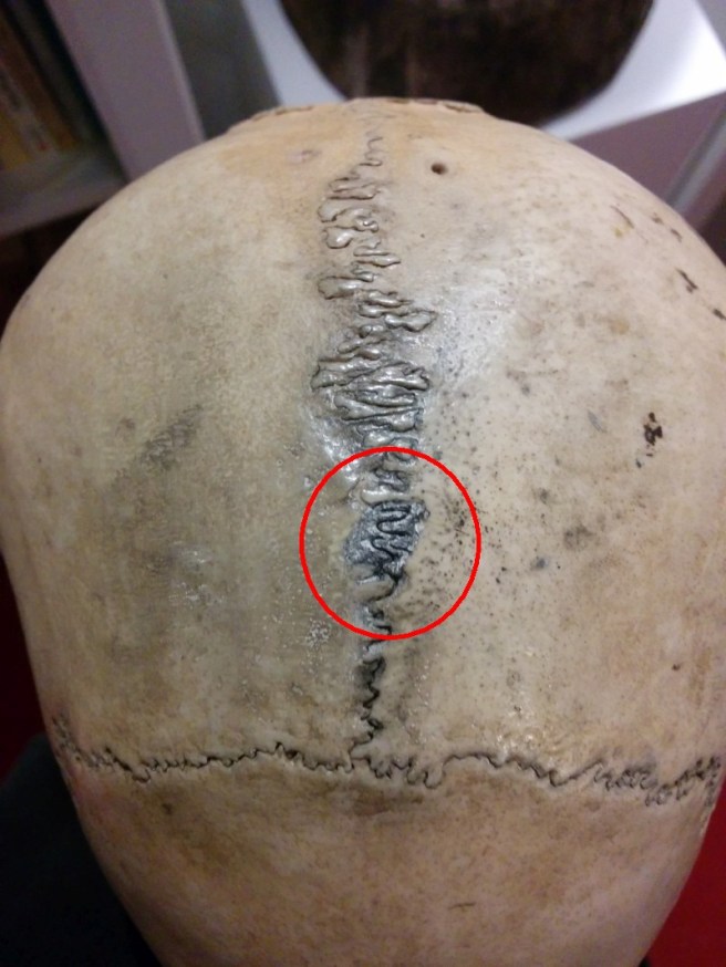 Dass das Loch direkt in der Schädelnaht platziert ist, verkompliziert die Ausbesserungsarbeit, bringt aber gleichzeitig den Vorteil, dass man die Ausbesserungsstelle „verstecken“ kann. Während der Gips sich verfestigte, habe ich mit einer Nadel die Schädelnaht nachgezogen bzw. immitiert. Das wäre bei Epoxy oder Sekundenkleber nicht möglich gewesen. Nach der Durchtrocknung habe ich zum Abschluss etwas Graphitstaub aus dem Bleistiftspitzer darüber verwischt um einen optischen Übergang zu erzielen.
