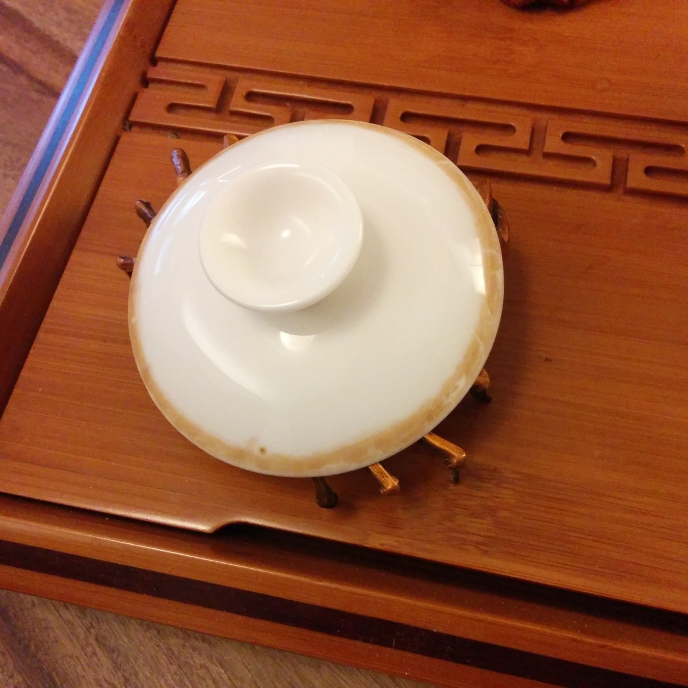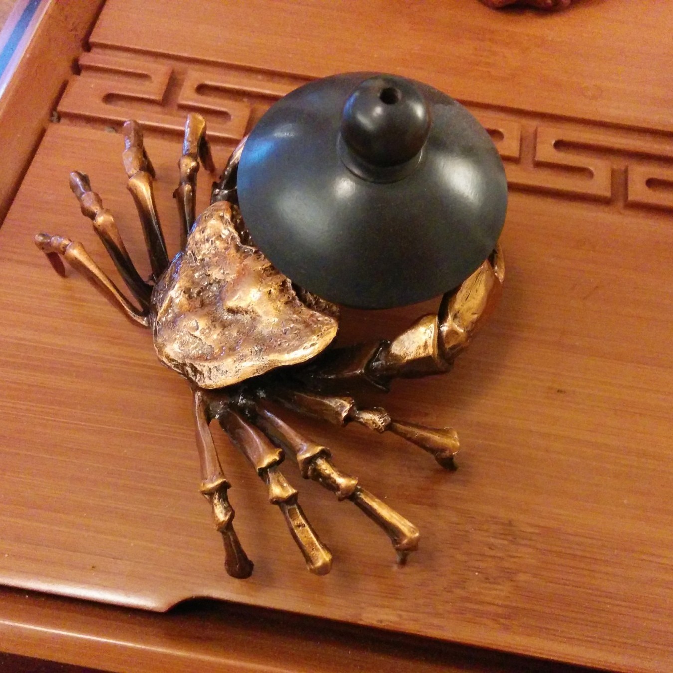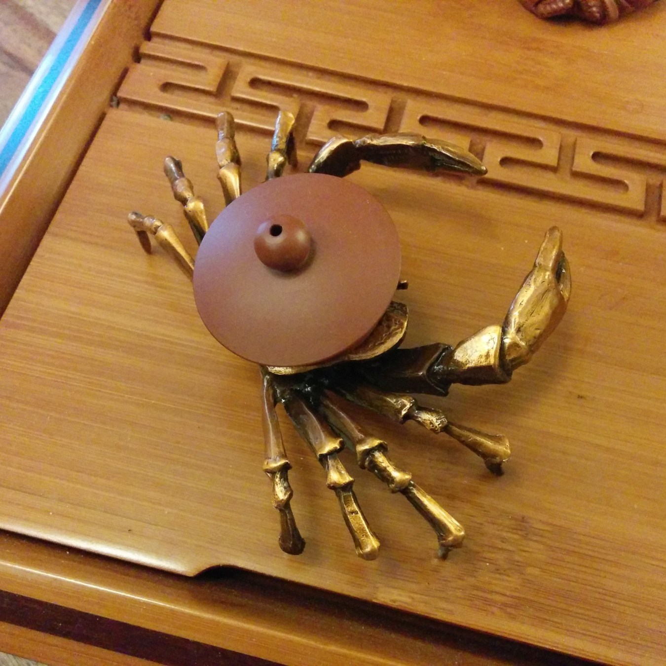 Ein Deckelhalter hat mir zu meinem Tee-Glück noch gefehlt. Diese Krabbe erledigt den Job vorzüglich. Sie trägt nicht nur Gaiwan-Deckel, sondern auch kleinere Tonkannendeckel. Schwere Ausführung, Kupferlegierung.
