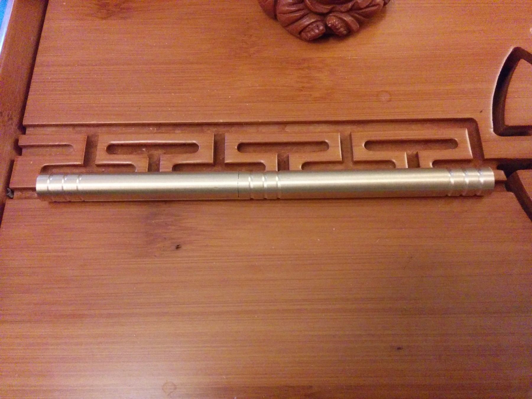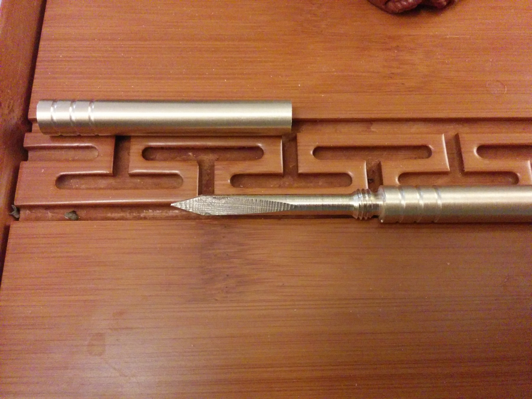 Und zu guter Letzt eine aufschraubare Pu-Erh-Nadel, präzise gefräst aus einer Messingstange. Schönes Ding, aber ein bischen zu dünn und aufgrund der Kürze und dem scharfkantigen Ende nur für locker gepresste Teekuchen geeignet. Ich habe einige knüppelharte Tee-Bricks, für die man besser eine griffigere Alternative verwendet, die sich nicht in den Handballen bohrt.