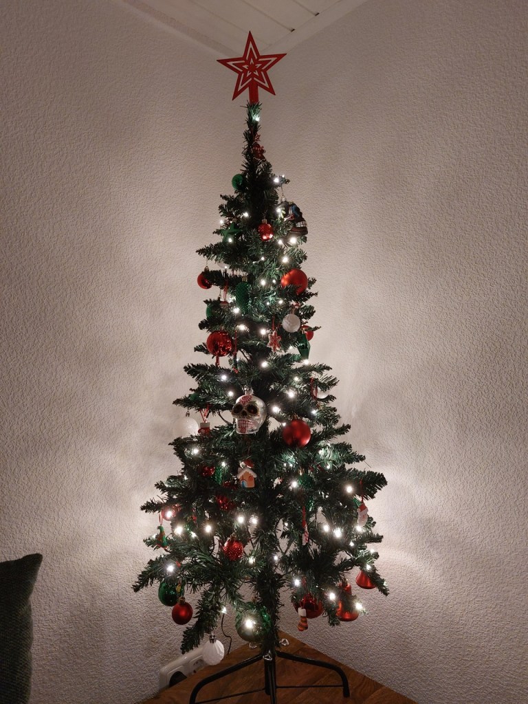 Das erste mal seit langem hatte ich das Bedürfnis, mal wieder etwas weihnachtlichen Kitsch in die Bude zu bringen. Meine Wahl ist auf einen recht günstigen Plastikbaum gefallen. Beleuchtet sieht der sogar richtig gut aus, wenn man nicht zu nah dran geht.