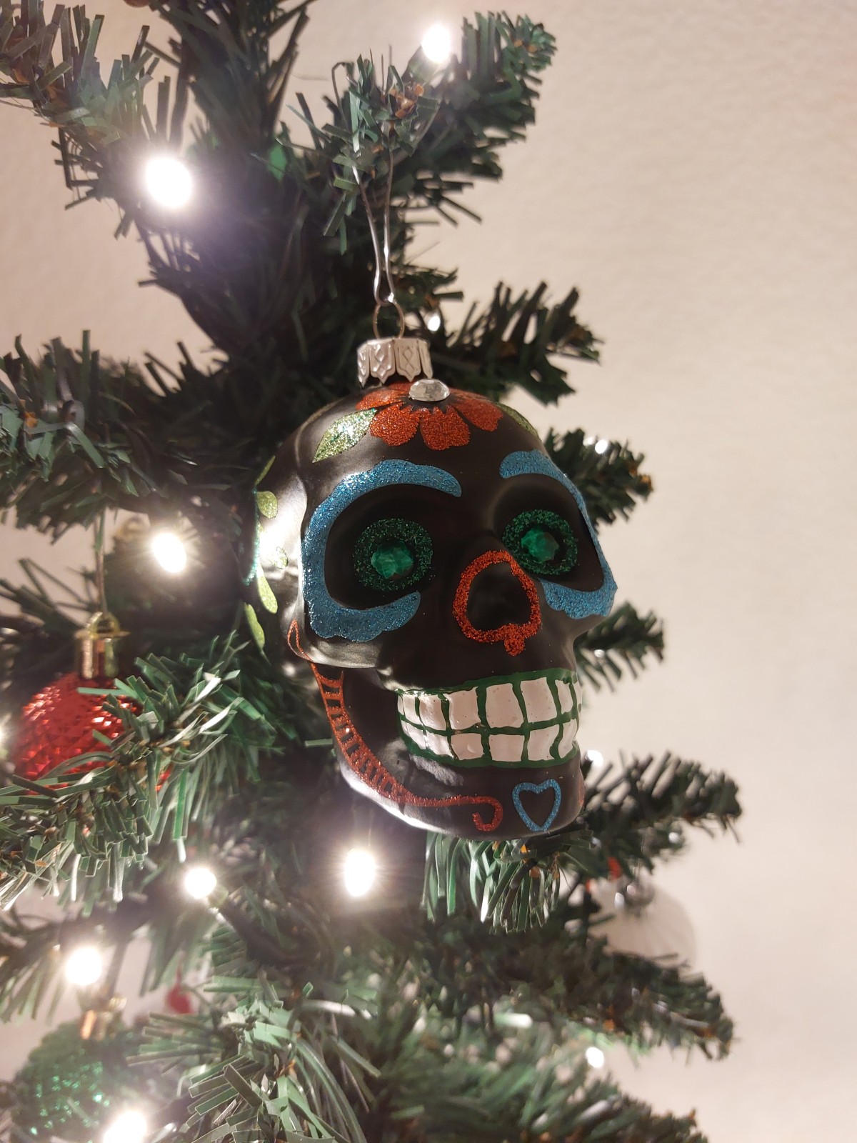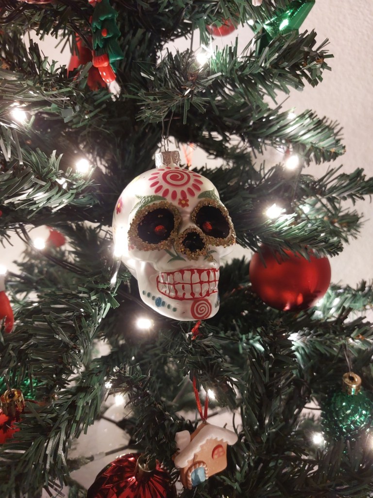 Neben klassischen Kugeln, Tannenzapfen, Sternen und niedlichen Nikoläusen, Lebkuchenmännern und -Frauen und Wichtelmützen, konnte ich nicht widerstehen, und habe standesgemäß zwei schmucke Schädel an die künstliche Nadelpracht gehängt. Die zwei Anhänger waren zwar teurer als der Baum selbst. Aber man muss Prioriäten setzen.