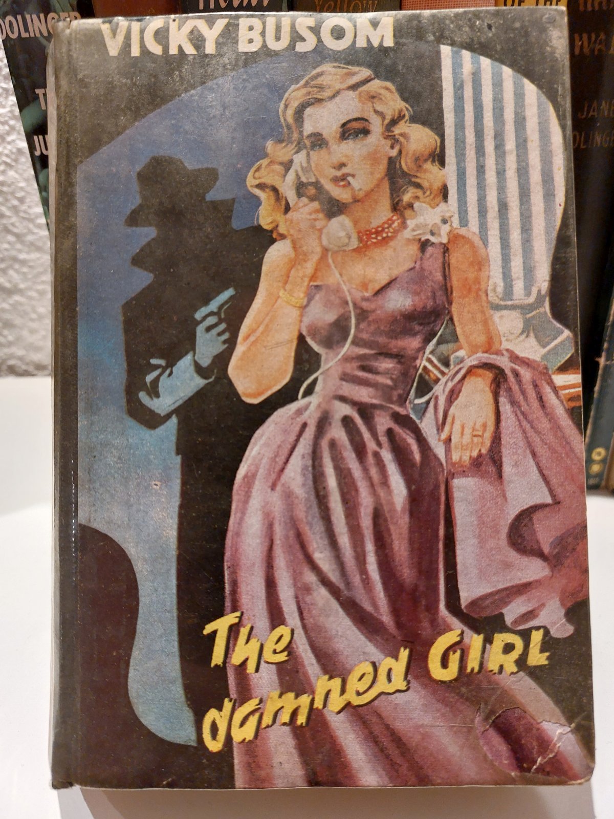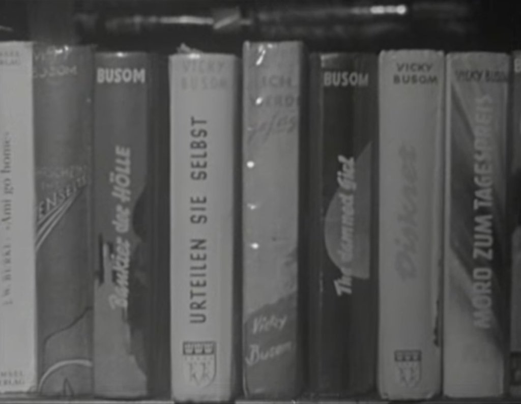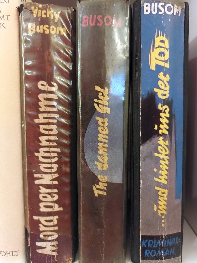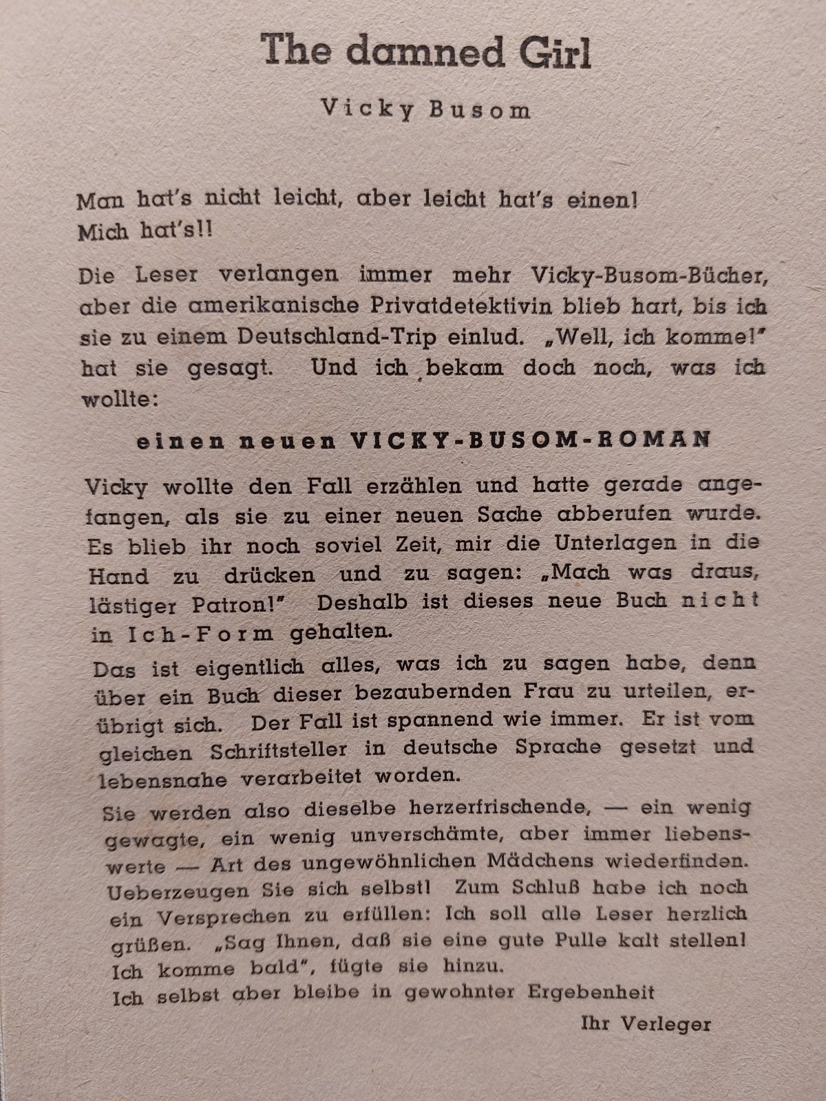Was für ein Glück: Zufälligerweise habe ich dieses Buch auch im Regal. In meiner eigenen Bibliothek der beanstandeden Bücher sozusagen. Der Roman heißt eigentlich „The Damned Girl“, obwohl es ein deutsches Buch ist. Im Alka-Verlag, Köln erschien in den 50ern und 60ern eine ganze Reihe von Vicky-Busom-Romanen als reine Leihbücher. Vicky Busom war (natürlich) ein Pseudonym, hinter dem sich diverse Autoren versteckten. Einer von ihnen war Vielschreiber Günter Dönges. Die Romane wurden so beworben, als handele es sich bei Vicky Busom um eine echte amerikanische Privatdektivin, die aus ihrem Leben erzählt.