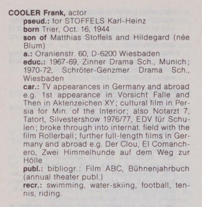 Wer ist der unbekannte Schauspieler, der in keiner Filmdatenbank auftaucht? Weder unter Karl-Heinz Stoffels noch unter dem skurrilen Pseudonym Frank Cooler. Bevor jemand denkt, ich hätte eine Antwort, ich weiß es auch nicht.