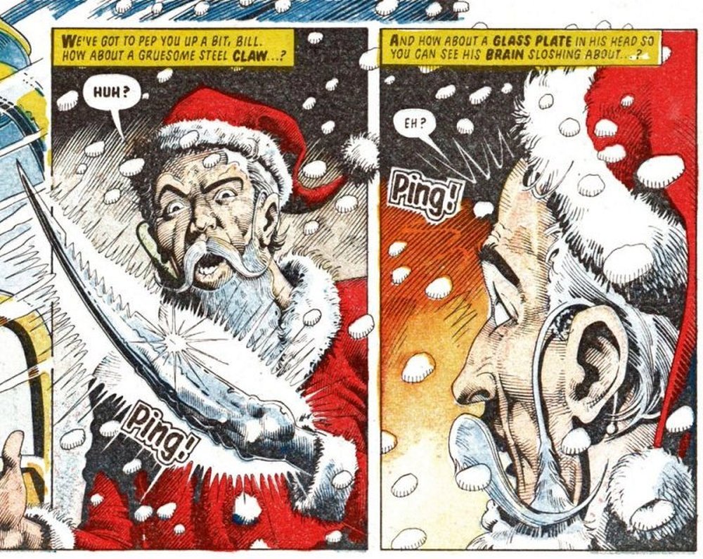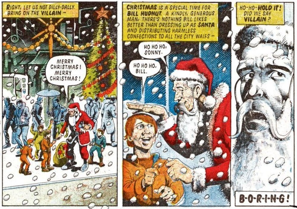 In der allerersten Weihnachts-Geschichte beispielsweise, Red Christmas (2000 AD Prog 44, 1977), hat es der Schurke Geek Gorgon in der Gestalt des Weihnachtsmanns auf Dredd abgesehen und entführt Dredds Service-Roboter Walter.