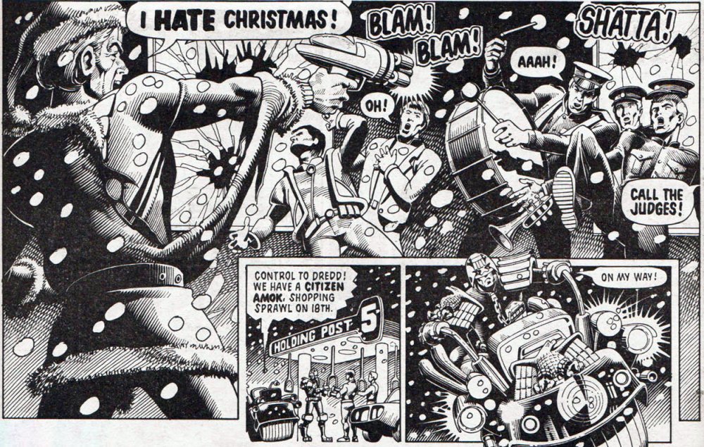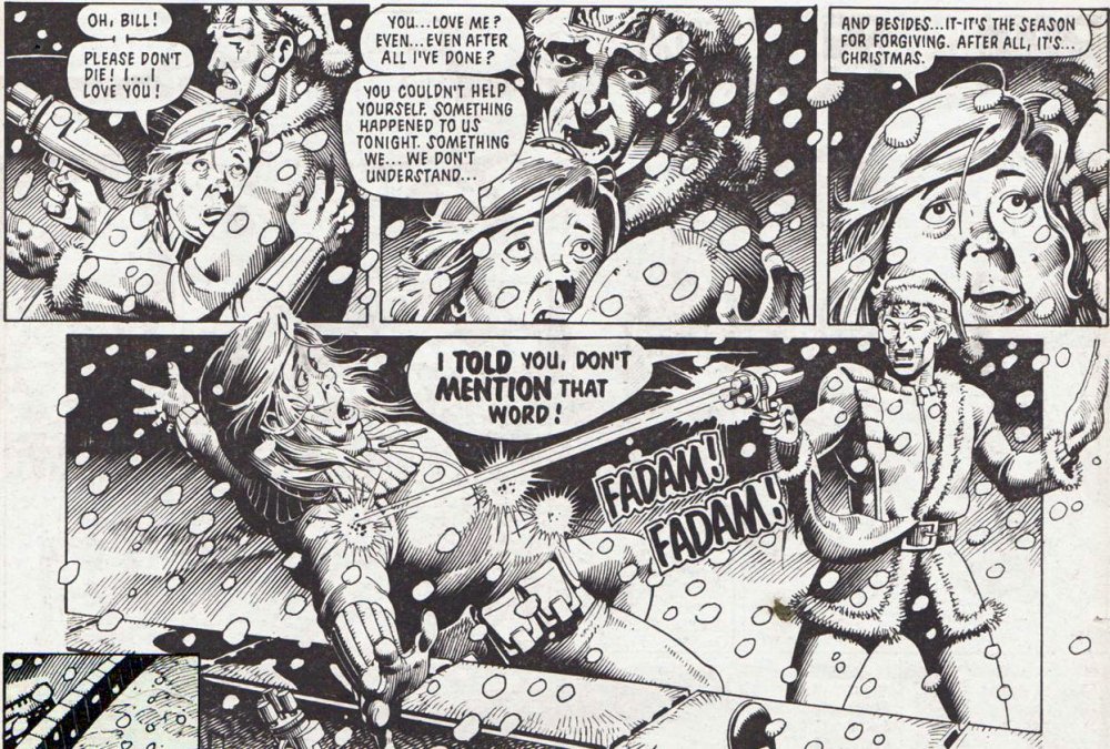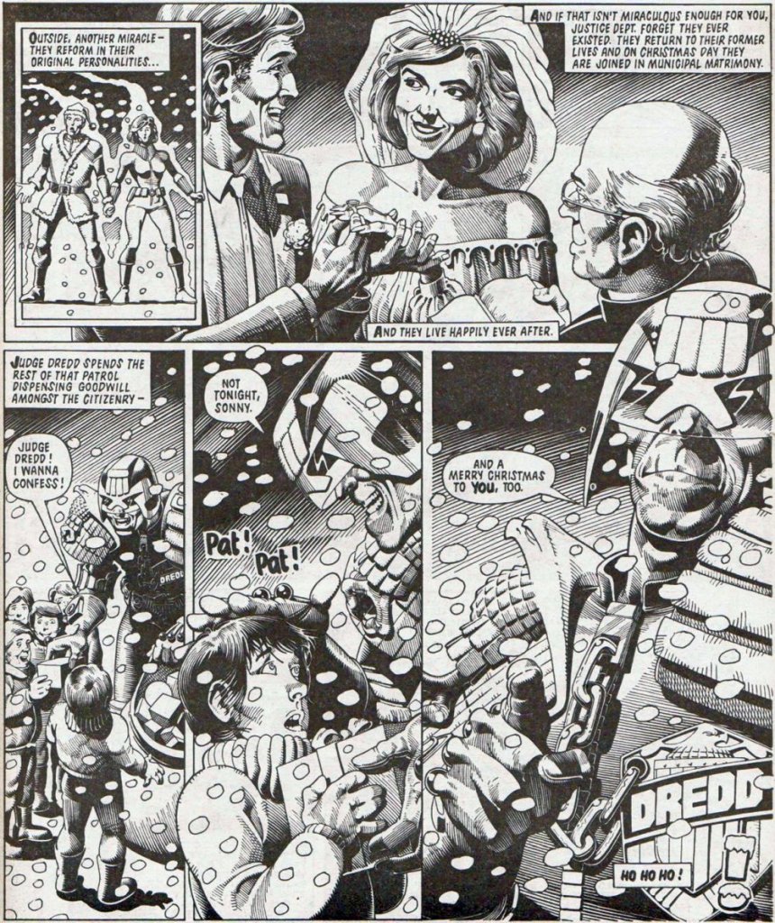 Und in The Santa Affair (2000 AD Winter Special, 1989) verkleiden sich Dredd und eine Einheit weiterer Judges gar selbst als Weihnachtsmänner, um eine kriminelle Weihnachtsmannbande zur Strecke zu bringen. Diese unheilige Nacht überleben gleich mehrere Weihnachtsmänner auf beiden Seiten nicht.