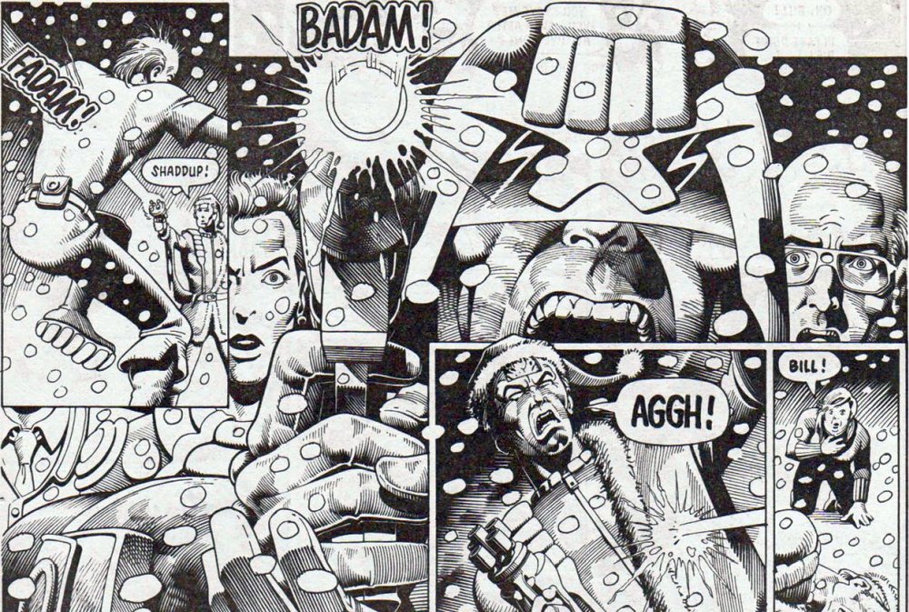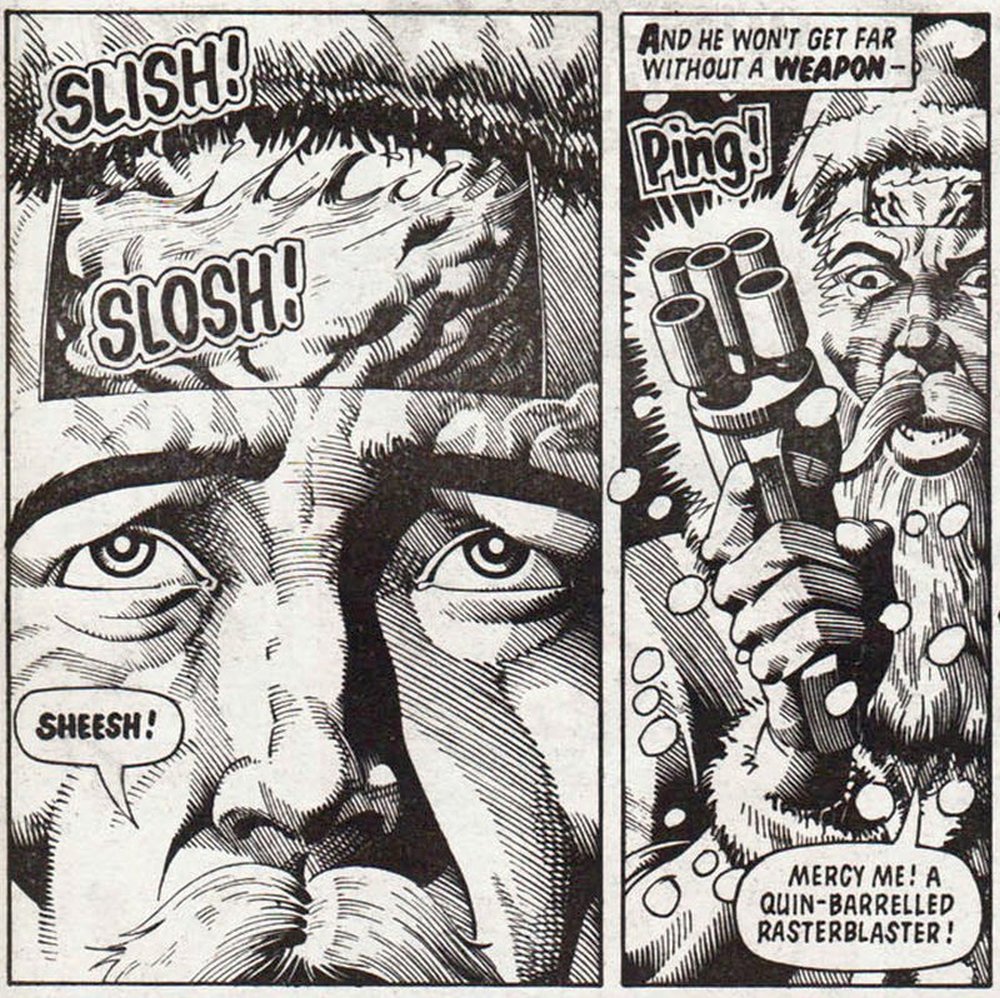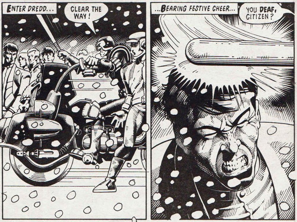 Es ist eine dieser Meta-Geschichten, in denen der Erzähler während des Erzählens die Geschichte kreiert und verändert. Ist das der Geist der Weihnacht oder doch nur Autor John Wagner? Es beginnt damit, dass der Erzähler erst mal einen Schneesturm in Mega-City One entstehen lässt, was Dredd verwundert. Er kontaktiert Weather Control, die eine Fehlfunktion bestätigen. Normalerweise unterliegt das gesamte Wetter von Mega-City One ja der Wetterkontrollstation.