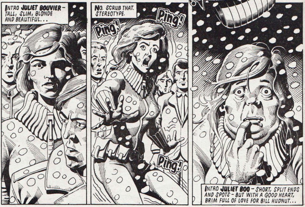 Unterdessen macht uns der Erzähler mit Bill Hudnuts Freundin bekannt, denn eine gute Weihnachtsgeschichte braucht natürlich auch etwas fürs Herz. Juliet Bouvier ist eine große, schlanke, blonde Schönheit… Nein, so geht das nicht. Zu stereotyp. Ping, ping, ping und schon wird aus Juliet Bouvier Juliet Boo: klein, pickelig, die Haare splissig, aber mit einem guten Herzen und voller Liebe für Bill.