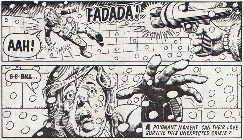 Fadam! Badam! Nun überschlagen sich die Ereignisse. Bill erschießt den John-Carlisle-Fanboy, Dredd muss reagieren und feuert auf Bill.