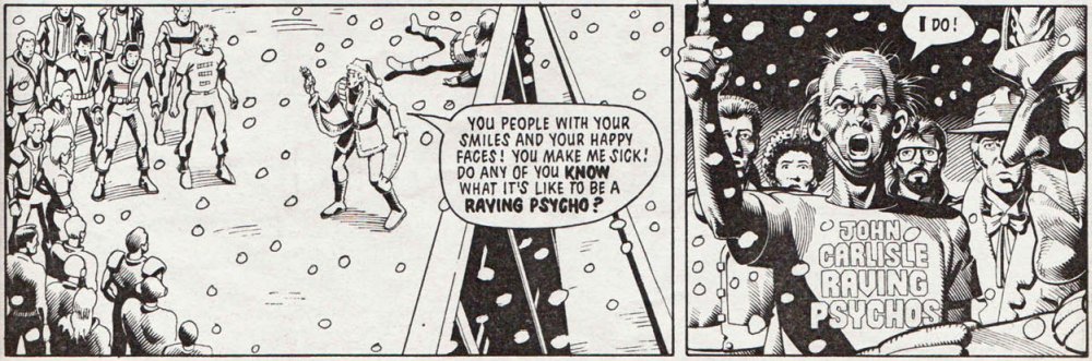 An dieser Stelle ist eine kleine Exkursion in die Stadtkunde angebracht. Mega-City One ist in unzählige riesige Cityblocks eingeteilt, die mehrere hundert Etagen hoch sein können und im Durchschnitt etwa 60.000 Einwohner beheimaten. Diese Blocks funktionieren wie eigene kleine Städte. Oftmals verlassen die Einwohner ihren Block Zeit ihres Lebens nicht, weil es schlicht keinen Grund gibt. Üblicherweise sind die Blocks nach historischen Persönlichkeiten benannt. Für den John-Carlisle-Block stand der britische Politiker John Russell Carlisle Pate, der wegen allerlei fragwürdiger Aktivitäten und Ansichten speziell in den 1970en und 1980ern in der Kritik stand. Unter anderem war er ein Fürsprecher des südafrikanischen Apartheid-Regimes. Als solcher rechter Hardliner passt sein Name natürlich vorzüglich in die Welt von Judge Dredd. Und dass auch noch jemand mit einem „John Carlisle Raving Psychos“ Fan-Shirt auftaucht, ist der Knaller.