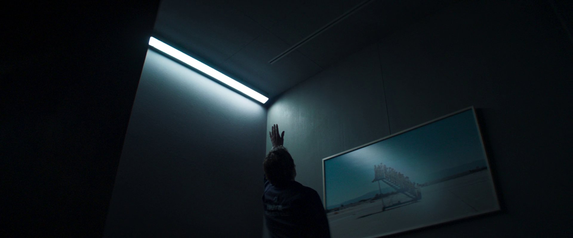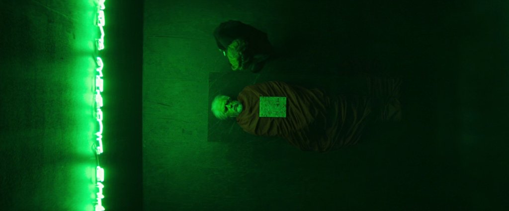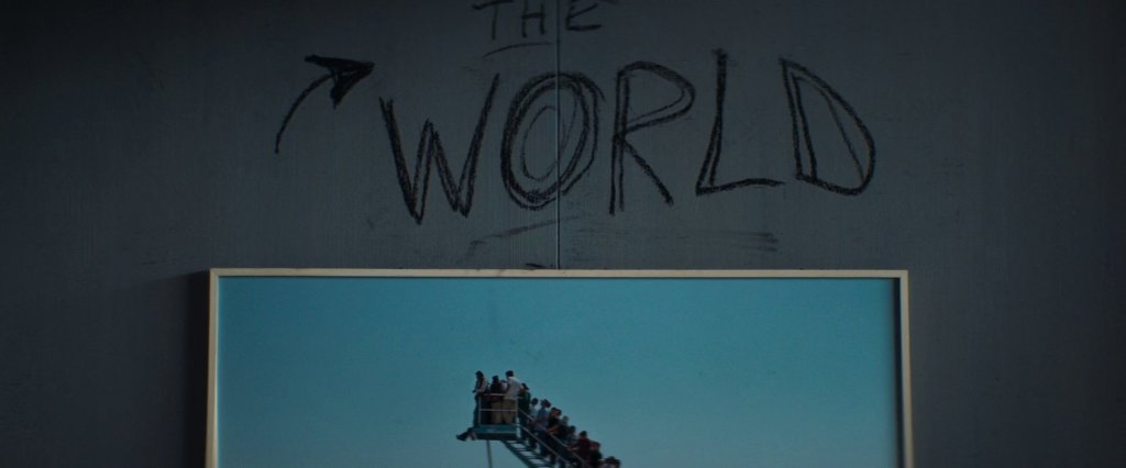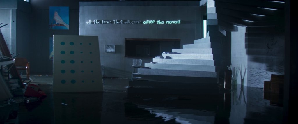 Später im Film, nachdem die Sprinkleranlage alles unter Wasser gesetzt hat, fällt ein Teil der Beleuchtung aus, und von dem hoffungsvollen Spruch bleibt ein ungewisses „after this moment“ übrig. Nach diesem Moment. Ja, was nur folgt auf diesen Moment? Die Szenerie erinnert an die Auswirkungen einer Flut. Die hat etwas Zerstörerisches, aber auch etwas Reinigendes, aus dem Neues entsteht.