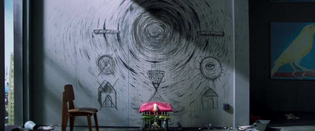 Nemo arbeitet weiter daran, die Verschraubungen am Dachfenster zu lösen. In den Pausen malt er mit Kohle an der Wohnzimmerwand an einem riesigen Bild. Links sieht man ein Haus mit verschlossener Tür, durchgestrichen. Und ein verkümmertes Auge, durchgestrichen. Gegenüber malt Nemo ein leuchtendes, sehendes Auge und das Haus mit offener Tür. Zwischen den beiden Seiten: eine Sanduhr, durch die die Zeit rinnt. Davor hat Nemo einen Schrein errichtet, auf dem er die einzelnen Muttern des Dachfensters aufbahrt. Das Gesamtwerk; Nemos Weg zur Freiheit.
