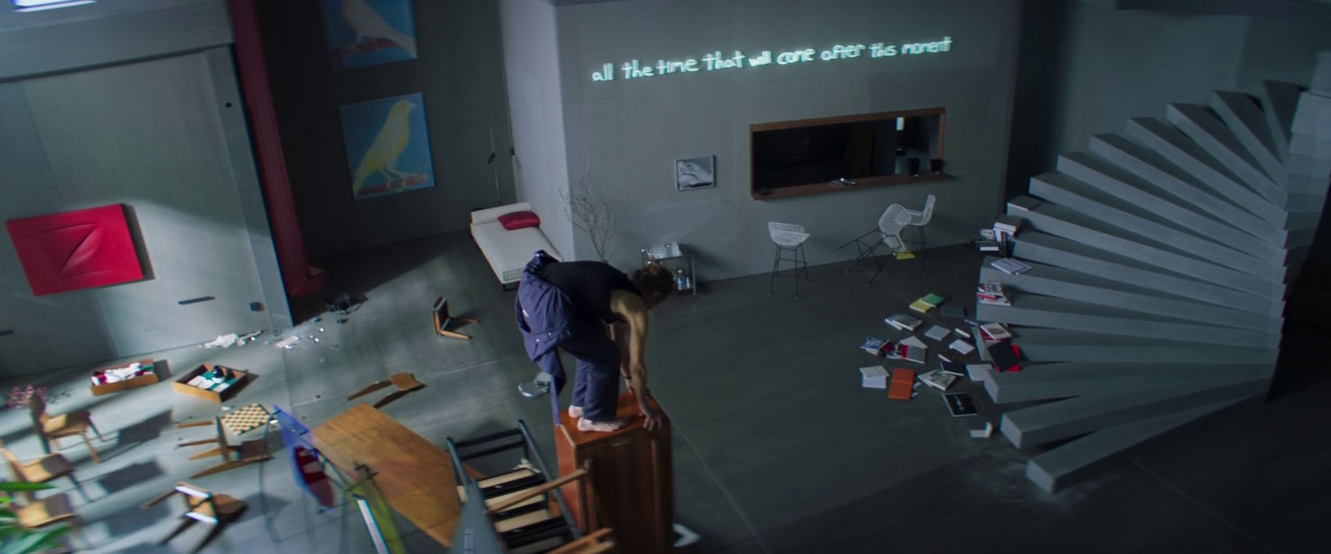 Als Nemo in dem Deckenfenster seinen Fluchtweg erkennt, realisiert er, dass er zugleich zerstören muss, um zu erschaffen. Aus den teuren Designer-Möbeln ringsum baut er einen Turm, in der Hoffnung, das Dachfenster so erreichen zu können. Wie ein anspornendes Versprechen leuchtet dabei im Hintergrund an der Wand die Neonlichtskulptur von David Horvitz: „all the time that will come after this moment“. Egal, was jetzt ist. Denk daran, was kommen wird.