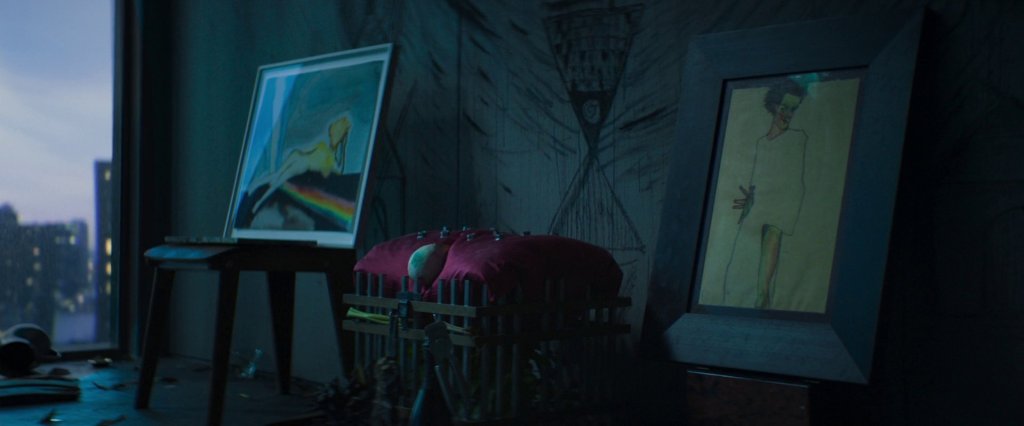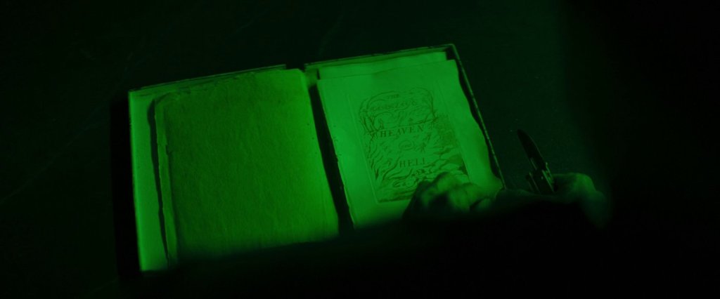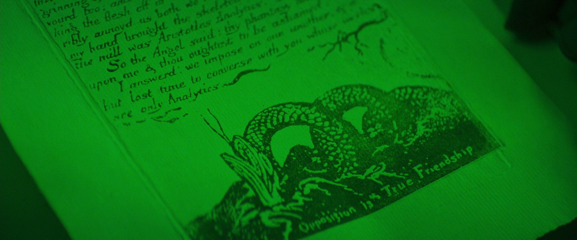 Auf der Totenpuppe liegt eine Ausgabe von William Blakes The Marriage of Heaven and Hell. Nemo blättert das Buch durch, sein Blick fällt auf Bildtafel 20 mit der schleichenden Schlange („sneaking serpent“), die sich im unendlichen Abgrund („infinite abyss“) windet, und er liest: „Opposition is True Friendship“. Eines der zahlreichen Sprichwörter, die Blakes Text entsprungen sind. Im Hintergrund leuchtet ein Neon-Schriftzug an der Wand und verkündet: „The Unseen World“. Genau gegenüber davon hängt das Schiele-Selbstporträt, das Nemo vergeblich in der Wohnung suchte. Das Unsichtbare wird sichtbar.