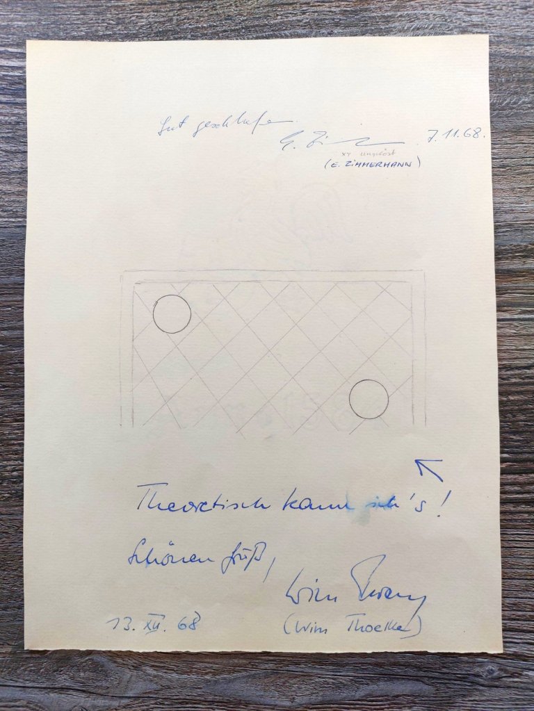 Fünf Tage später, am 13.12.1968, schreibt der damalige Moderator des Aktuellen Sportstudios, Wim Thoelke: „Theoretisch kann ich’s! Schönen Gruß“ und zeichnete noch eine Torwand dazu. Thoelke brachte damals zusammen mit Werner Schneider die berühmte Torwand ins Sportstudio.
