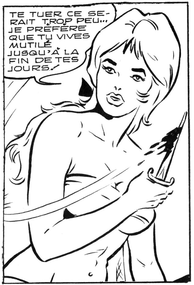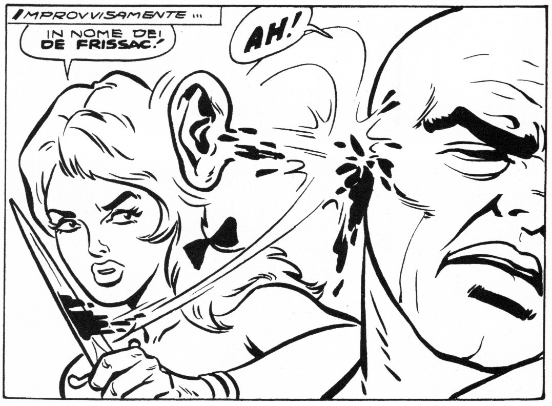 Im Ausland fanden die fumetti vor allem in Frankreich, Spanien und Holland größere Verbreitung. Dort nicht immer ohne Zensur. Folgend zwei Beispiele aus den französischen Ausgaben von Isabella #1 – La duchessa dei diavoli (2. April, 1966) und Isabella #2 – Nelle spire del barone (28. April, 1966). Links das italienische Original, rechts die zensierte Ausgabe. Die französischen Leser haben nur Panel-Ausschnitte ohne Gewaltdarstellungen zu sehen bekommen.