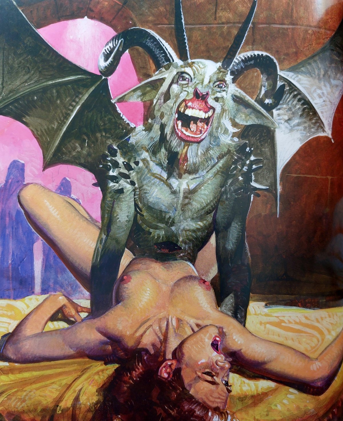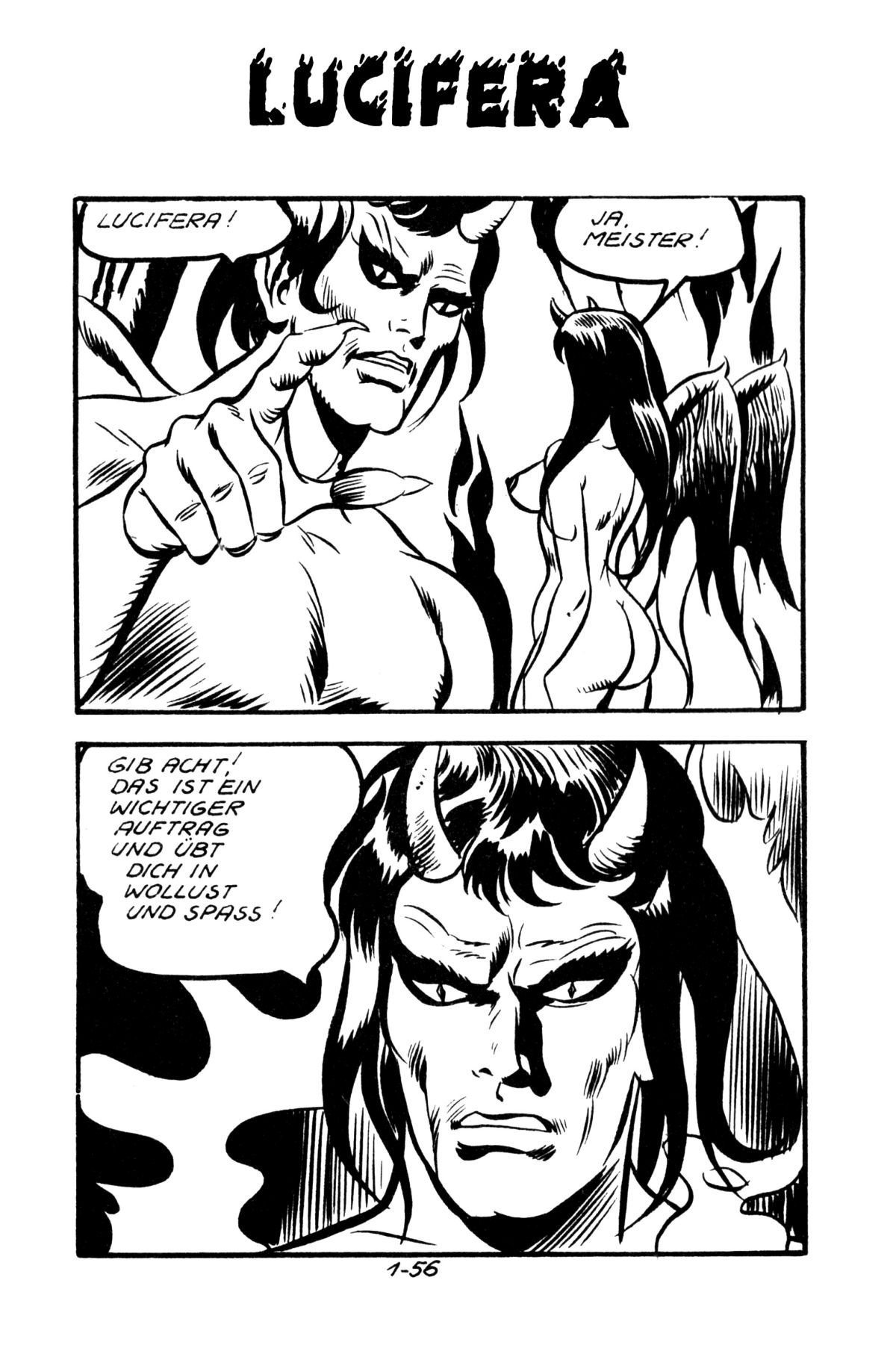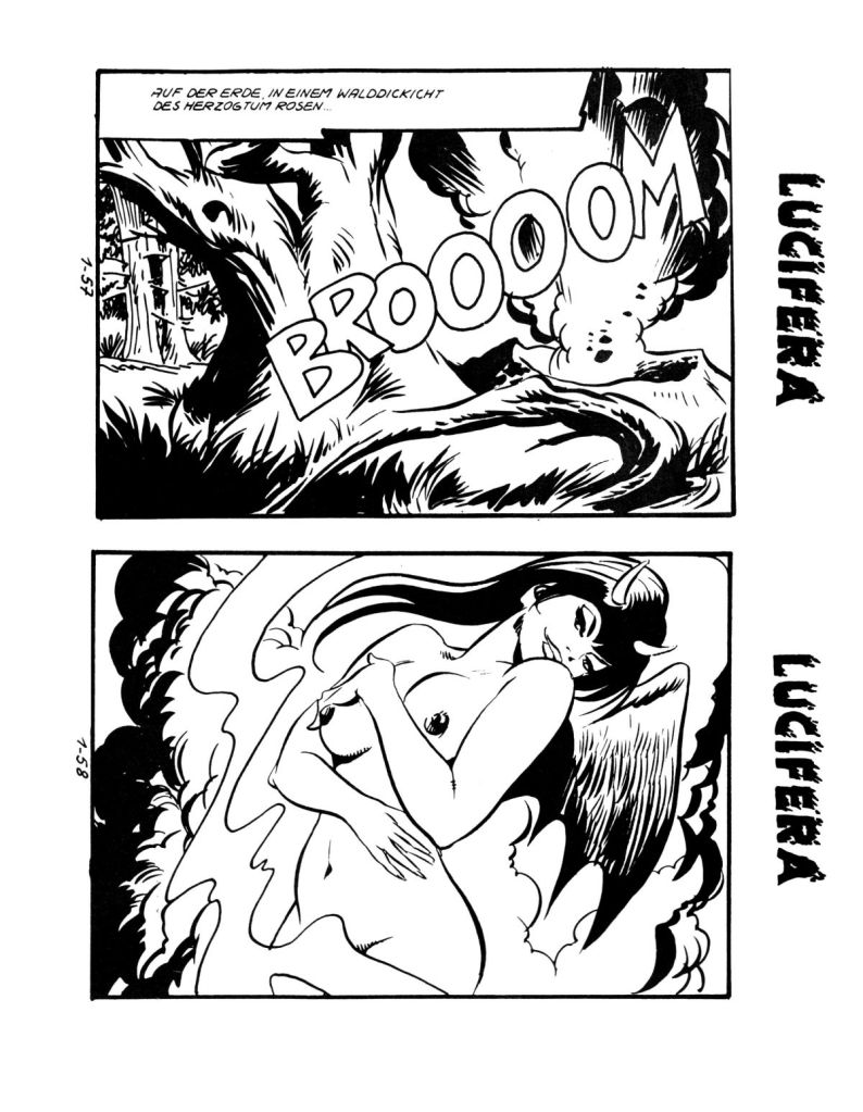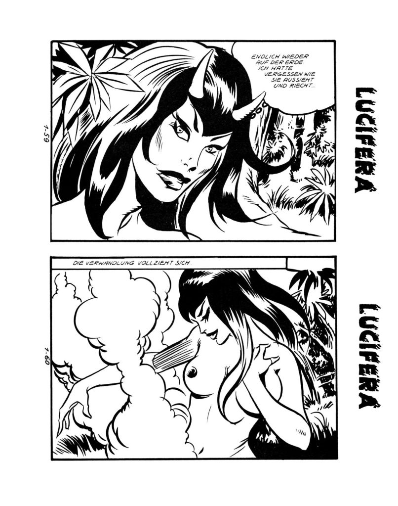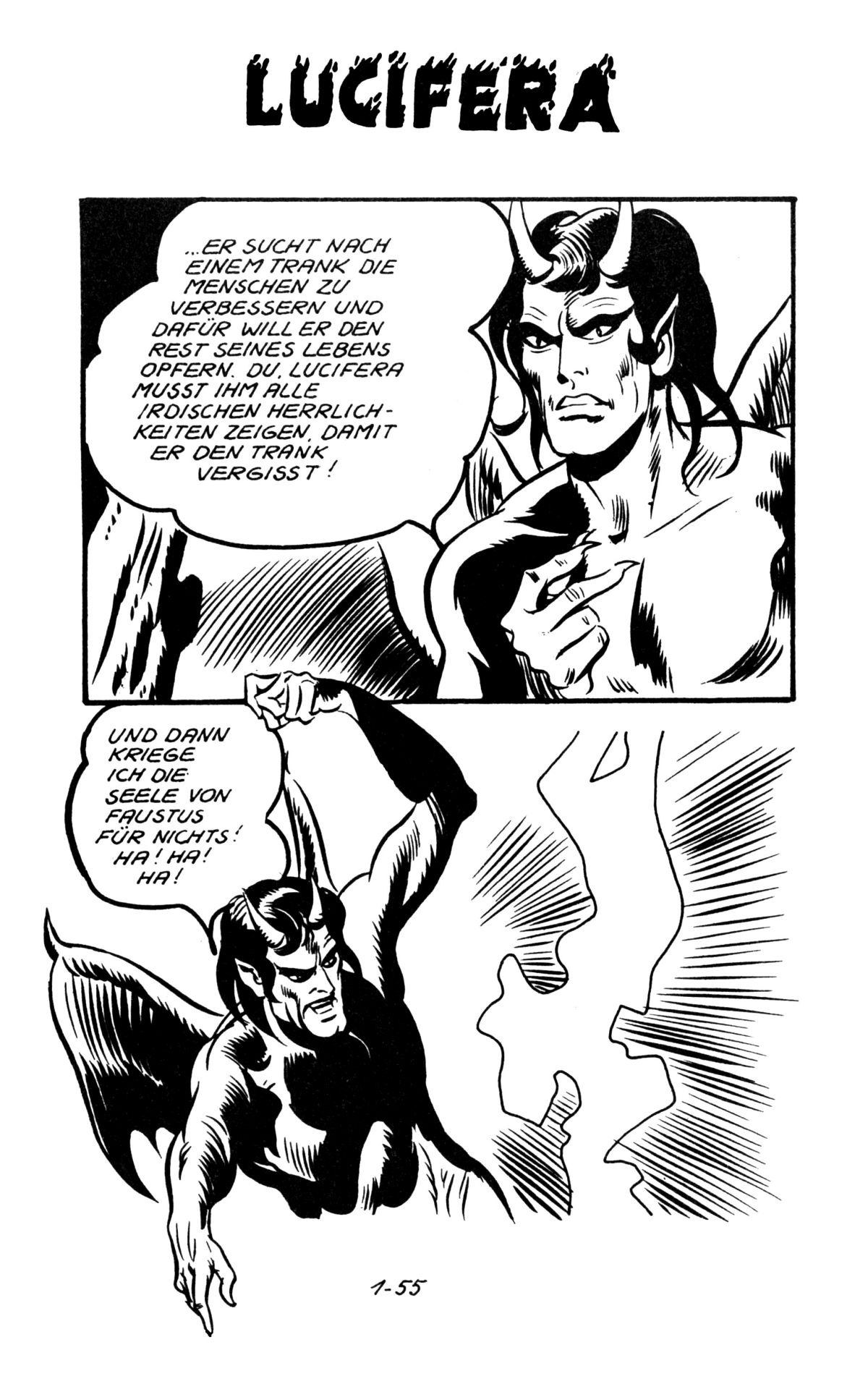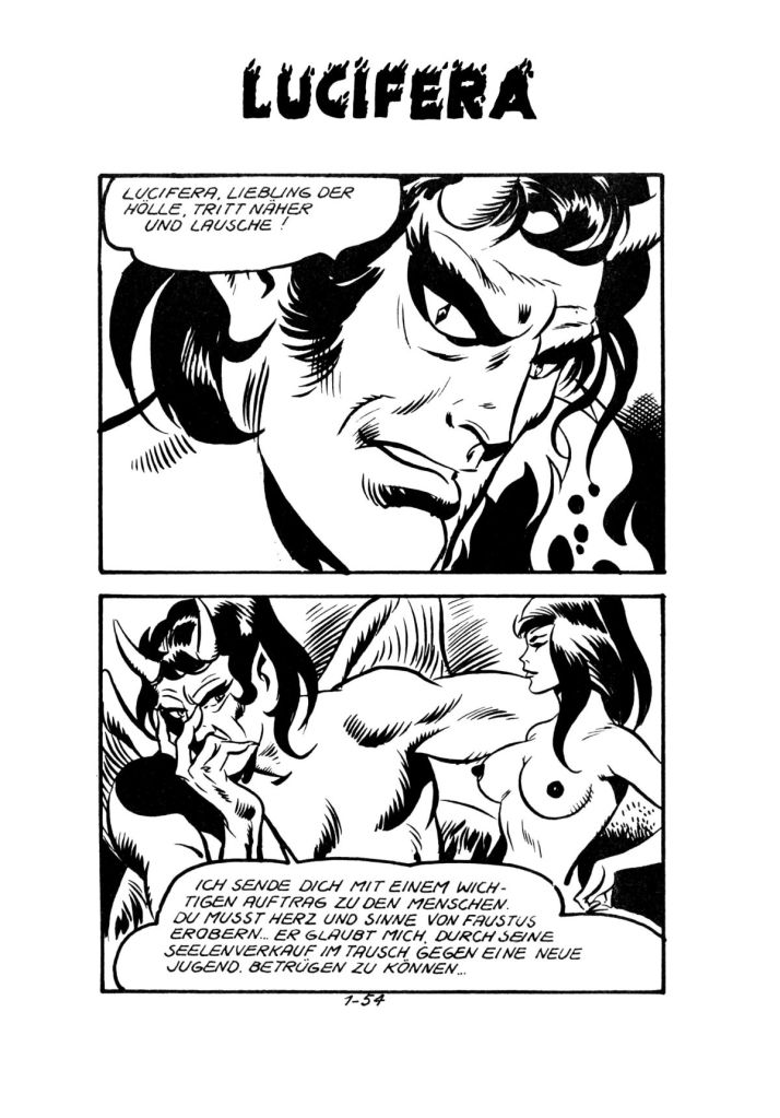 Folgend eine Panel-Sequenz aus Lucifera – Die Geliebte des Teufels, Band 1, Die Flammen der Hölle, deutsche Fassung des Freibeuter-Verlags, 1972. Lucifera wird vom Teufel auf die Erde geschickt, um Faustus zu verführen. Bei Goethe war das nicht Teil der Geschichte.