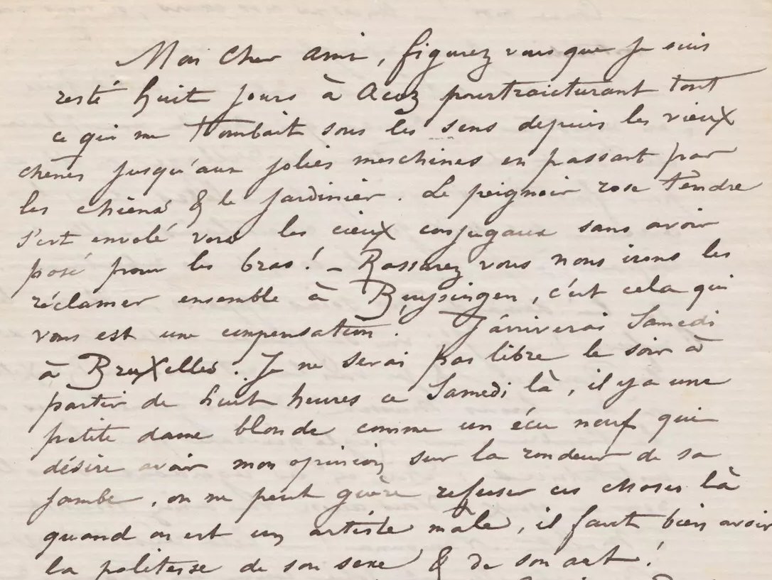 Ich werde am Samstag in Brüssel ankommen. Doch werde ich an jenem Abend ab acht Uhr nicht frei sein, denn eine kleine Dame, blond wie ein neuer Taler, wünscht meine Meinung über die Rundung ihres Beines zu hören. Solche Dinge kann man als männlicher Künstler kaum ablehnen; es gehört sich schließlich, seinem Geschlecht und seiner Kunst gegenüber höflich zu bleiben!