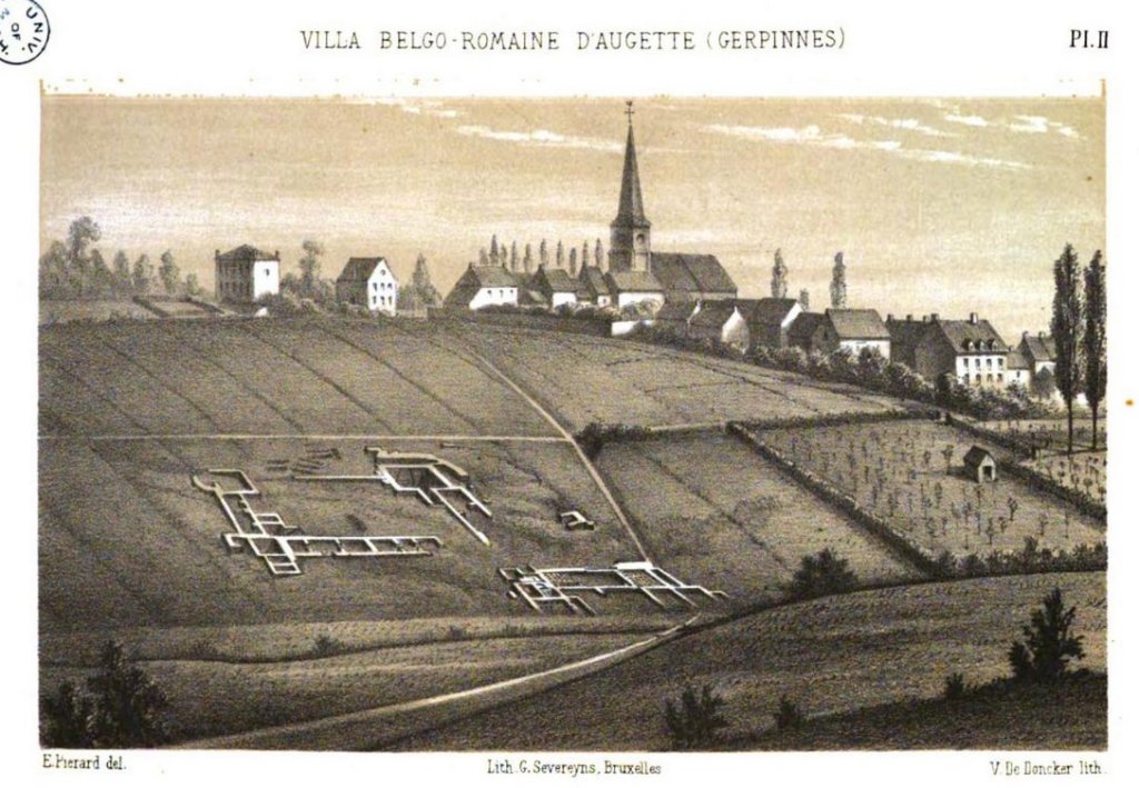 In Gerpinnes wurden 1872 die Überreste einer römischen Villa aus dem 3. Jahrhundert entdeckt, die Villa romaine d’Augette (Google Maps), benannt nach dem Hügel Augette. Was zunächst wie ein Kolumbarium (Urnenkammer) oder Lararium (Kultschrein) aussah, entpuppte sich als Keller, der zu einer Villa mit drei Haupthäusern, Badehaus und Hypokaustum (Luftflächenheizung) gehörte. Es war eine der ersten großen römischen Villen, die in Belgien entdeckt wurden. Ausführliche Informationen findet man in dem Ausgrabungsbericht der belgischen Société Royale Paléontologique & Archéologique von 1875 und in Bathing at the Edge of the Roman Empire (Prepols, 2023). Der Keller wurde überdacht und ist heute zur Besichtigung zugänglich. Siehe Bild 1. ↩︎