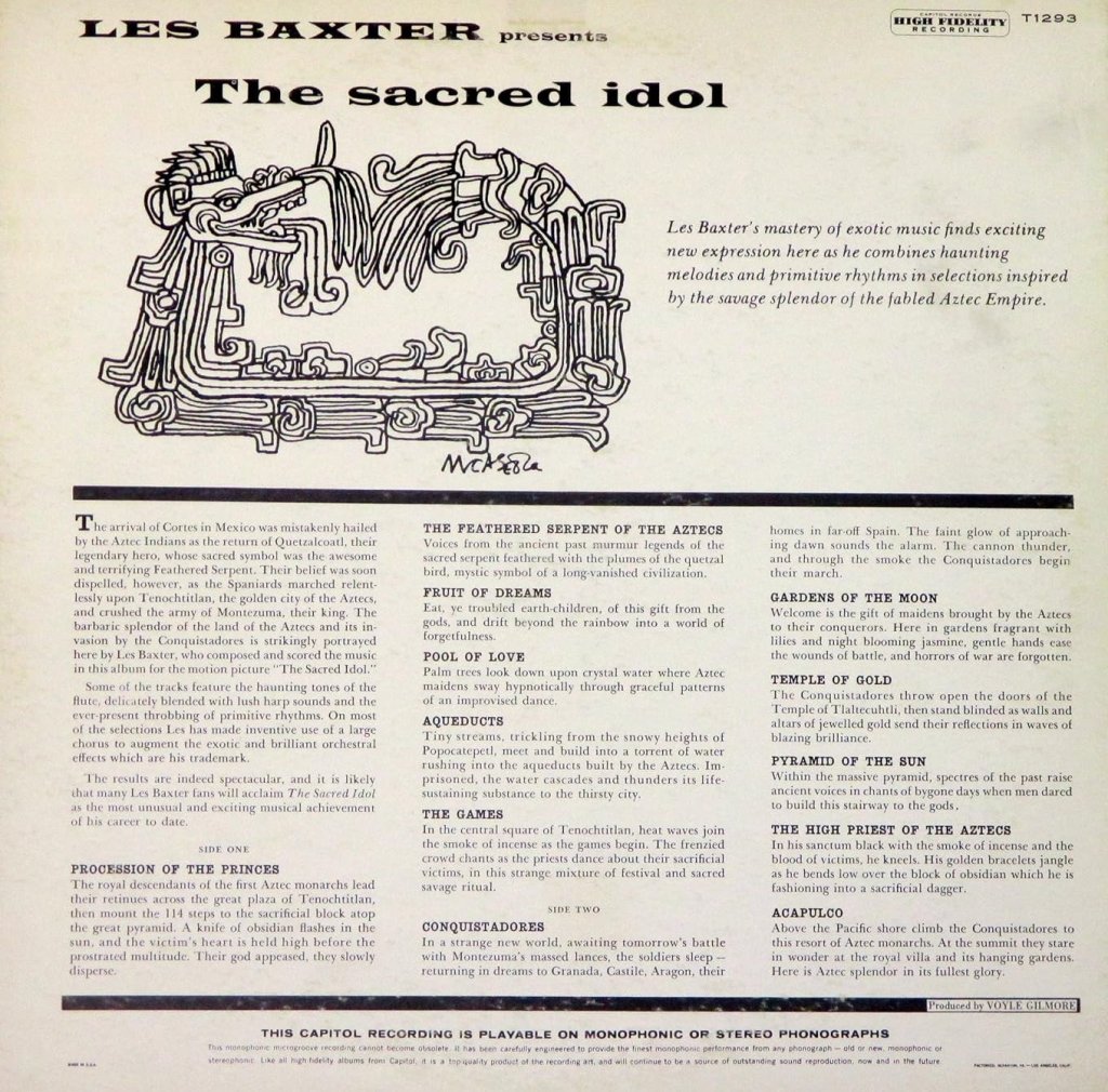 Ganz so altmodisch klingt das Album allerdings nicht. The Sacred Idol vereint typische Exotica-Motive mit der Dramatik eines Abenteuerfilms. Es dominieren Flöten, Harfen, Xylophon-Geklöppel und Percussion-Instrumente. Bläser sind nur akzentuiert zu hören. Als verbindendes Element der Songs fungieren die allgegenwärtigen vielstimmigen Chöre, die Baxter auch auf anderen Alben eingesetzt hat. Einzelne Momente erinnern hier an das erste Album von Yma Sumac, Voice of the Xtabay, das Baxter 1950 schrieb und orchestrierte. So ergibt sich aus diesen teils sehr unterschiedlichen Stücken, von dem erhabenen Procession Of The Princes über das nebulöse Fruit Of Dreams bis zum atonal chaotischen The High Priest Of The Aztecs, eine atmosphärische Klangreise durch ein märchenhaftes, mythisch verklärtes Azteken-Reich mit blutigen Ritualen, prachtvollen Landschaften und goldenen Tempeln. Auch wenn die Eroberung durch die Spanier im Stück Conquistadores zur heldenhaften Hymne gerät, egal. Schließlich sind weder La Ciudad Sagrada noch The Mighty Jungle kritische Auseinandersetzungen mit dem Kolonialismus. Es sind Unterhaltungsfilme und Les Baxter hat mit The Sacred Idol die passende Musik geliefert. Musik, die auch – und eigentlich insbesondere – ohne den Filmkontext funktioniert. Für Retro-Fans bleibt The Sacred Idol auch heute noch ein spannendes Hörerlebnis.