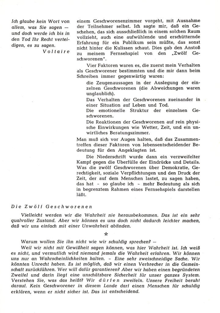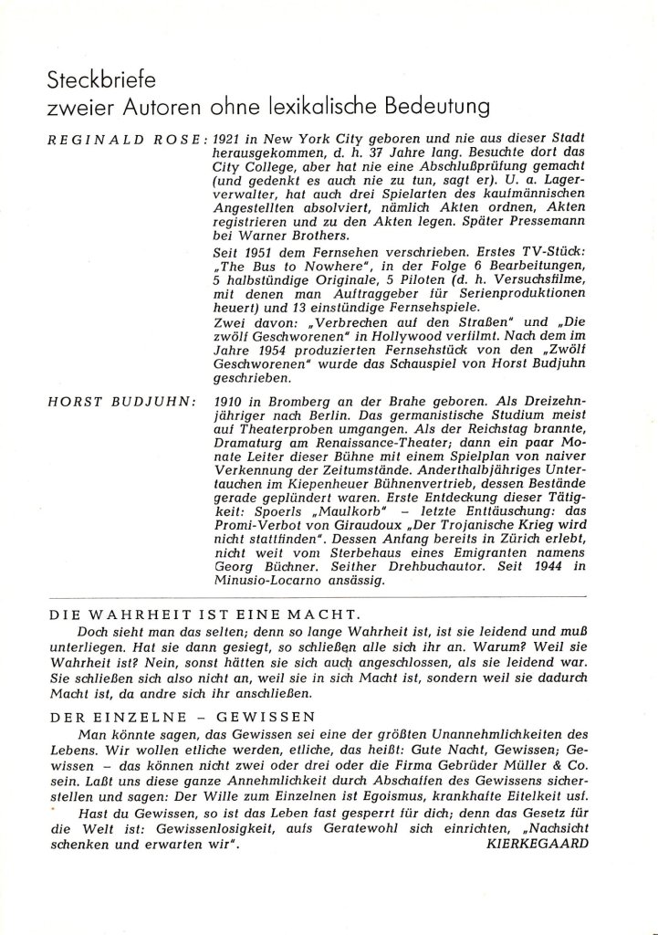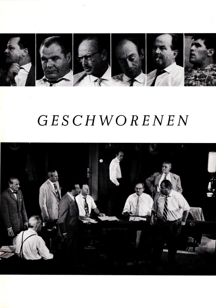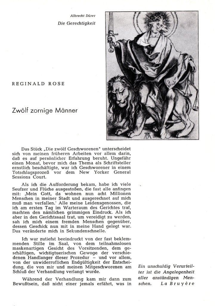Das Programmheft zur deutschen Uraufführung von Reginald Roses Die zwölf Geschworenen an den Münchner Kammerspielen 1958 habe ich in einem Online-Antiquariat entdeckt. Das Heft enthält einige interessante Texte zur rechtlichen und gesellschaftlichen Einordnung des Stücks. Außerdem erklärt Reginald Rose, wie ihn die eigene Erfahrung als Geschworener zu dieser Geschichte inspirierte.