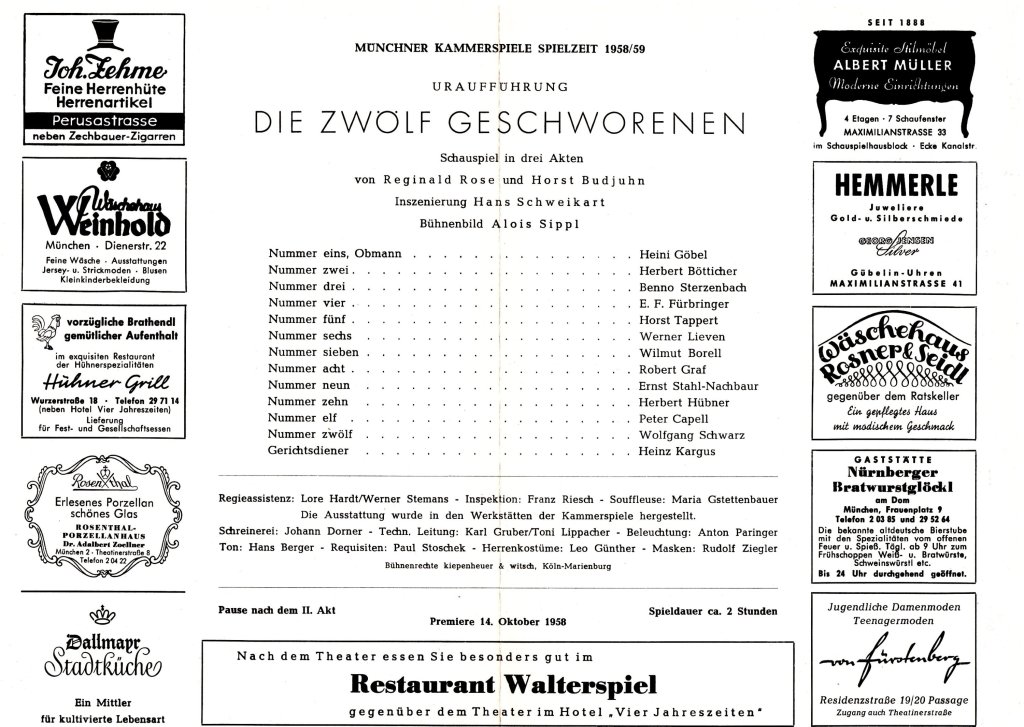 Auch Horst Tappert, der hier Geschworener Nummer 5 spielte, beschäftigte das Stück ein Leben lang. Er spielte es an die tausend Mal – und die tausend ist hier wörtlich zu nehmen – auf großen und kleinen Bühnen im ganzen Land, und inszenierte es auch als Regisseur.